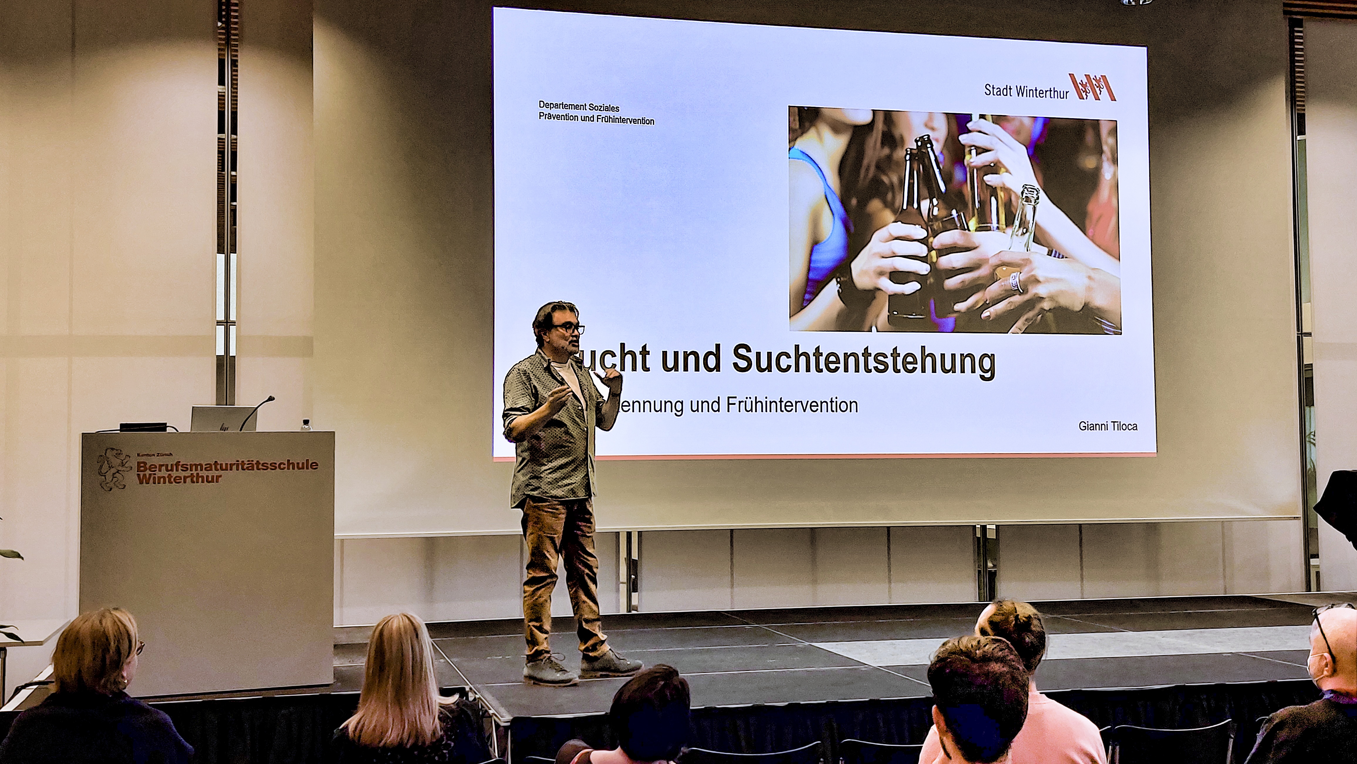 Das Thema des rund 1.5-stündigen Referats am Dienstagabend, 23. September 2025, sind sowohl Substanzsüchte wie auch Verhaltenssüchte. Dabei sei es – gemäss Gianni Tiloca, Fachmitarbeiter Prävention der Stadt Winterthur – gar nicht so einfach, an Daten von Personen zu kommen, die dem Alter der BMSW-Lernenden entsprechen. Die meisten Studien berücksichtigten entweder 11- bis 15-jährige Personen oder Menschen zwischen 15 und 30 Jahren.