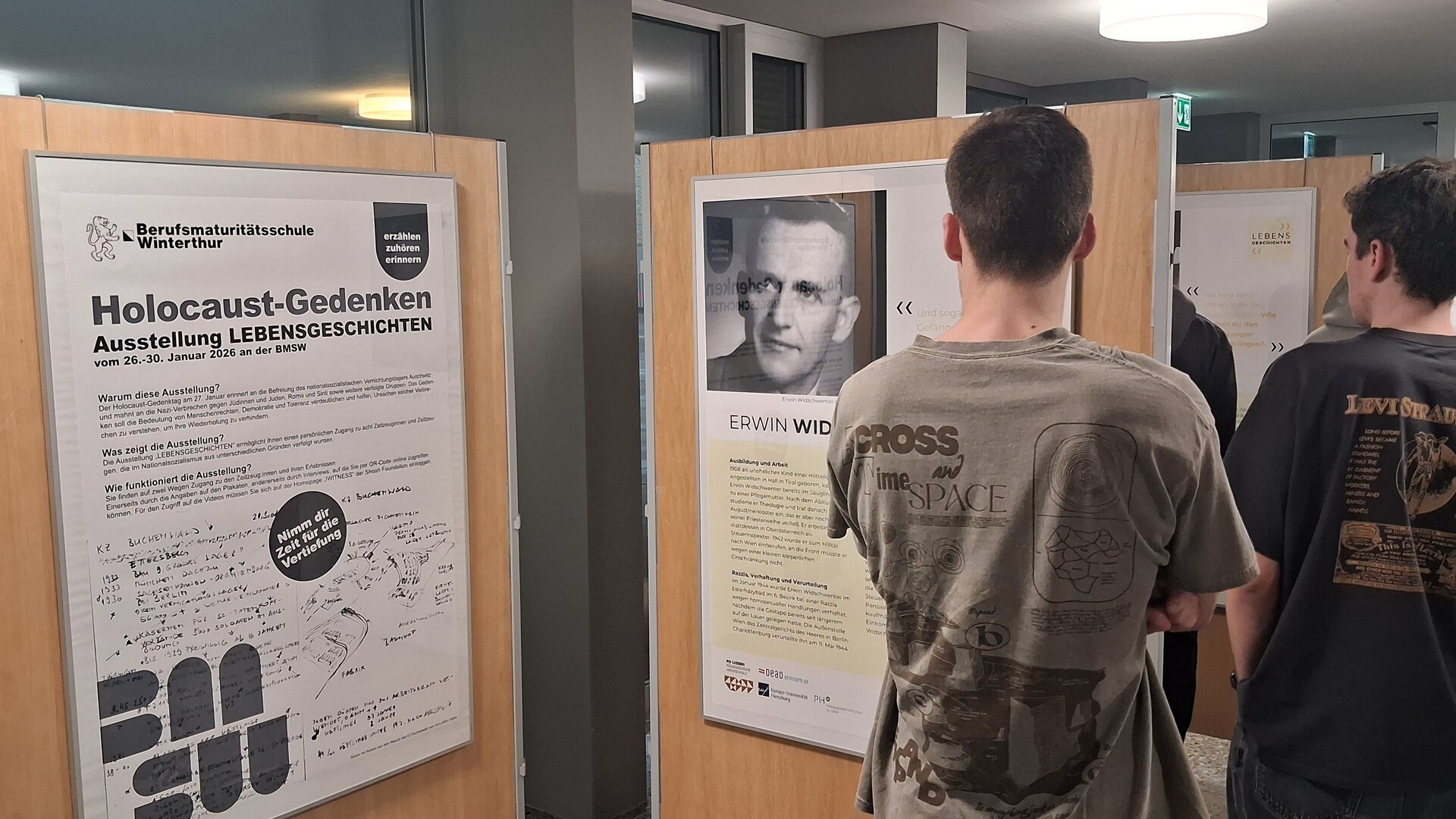 Organisiert von der Fachschaft Geschichte, zeigt die trinationale Plakatausstellung – entwickelt von schweizerischen, deutschen und österreichischen (Fach)Hochschulen – acht Lebensgeschichten von Menschen, die aus unterschiedlichen Gründen im Nationalsozialismus verfolgt wurden. Über Informationen auf den Plakaten sowie über vertiefende Video-Interviews, die per QR-Code abrufbar sind, erhalten die Lernenden Einblick in die Biografien der Verfolgten.